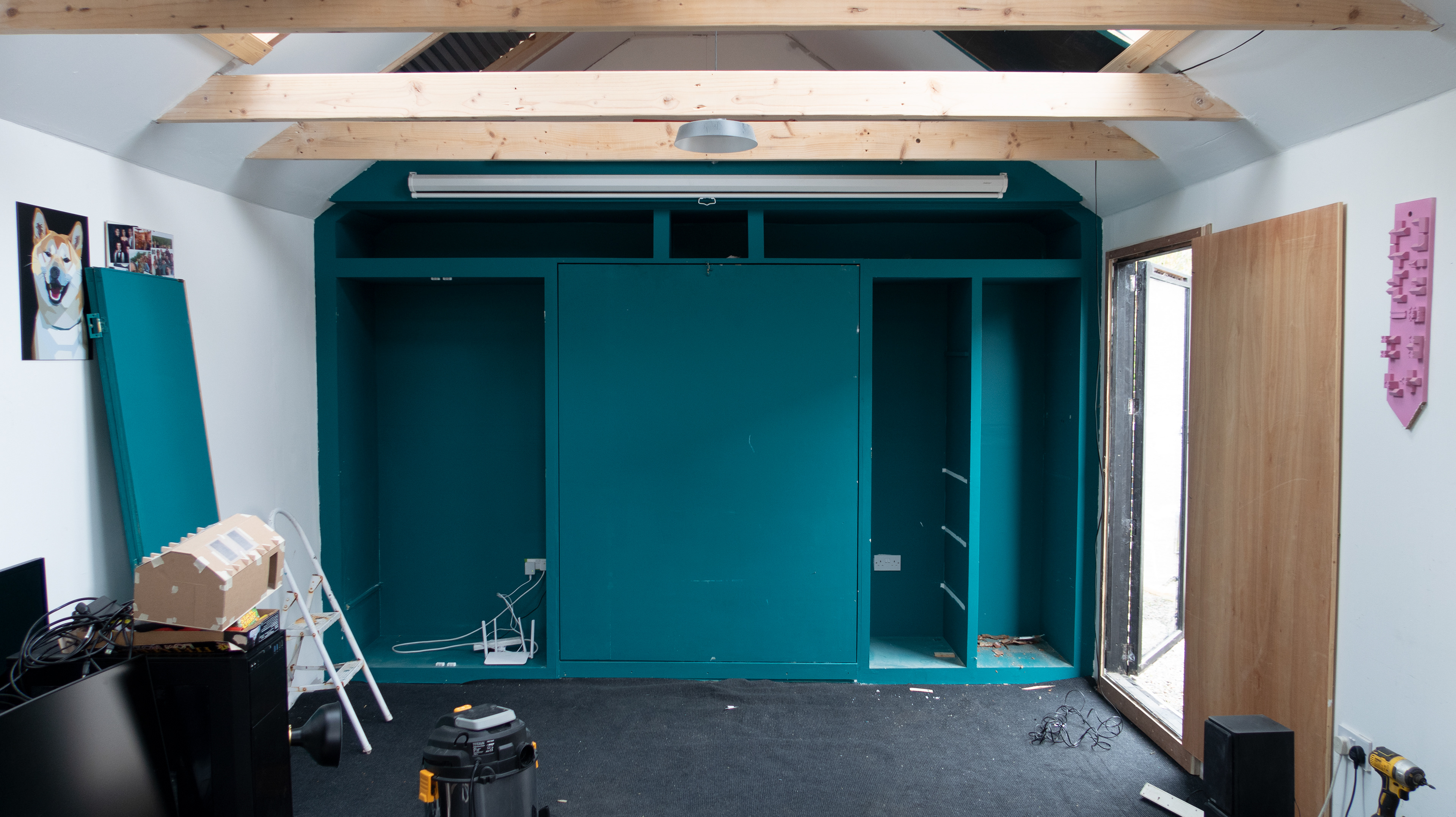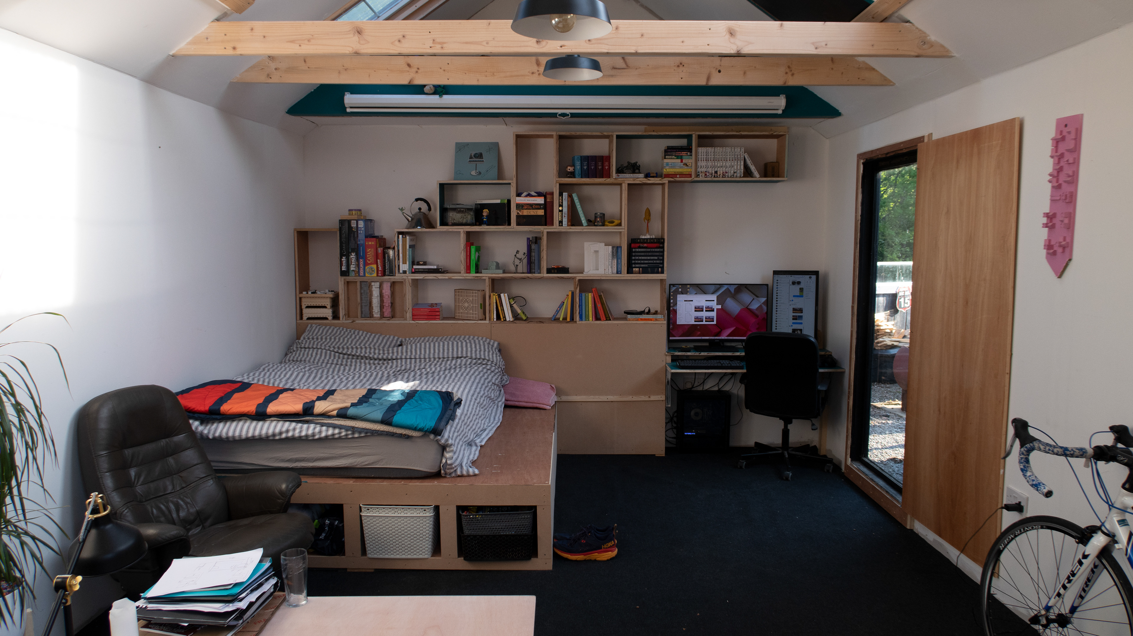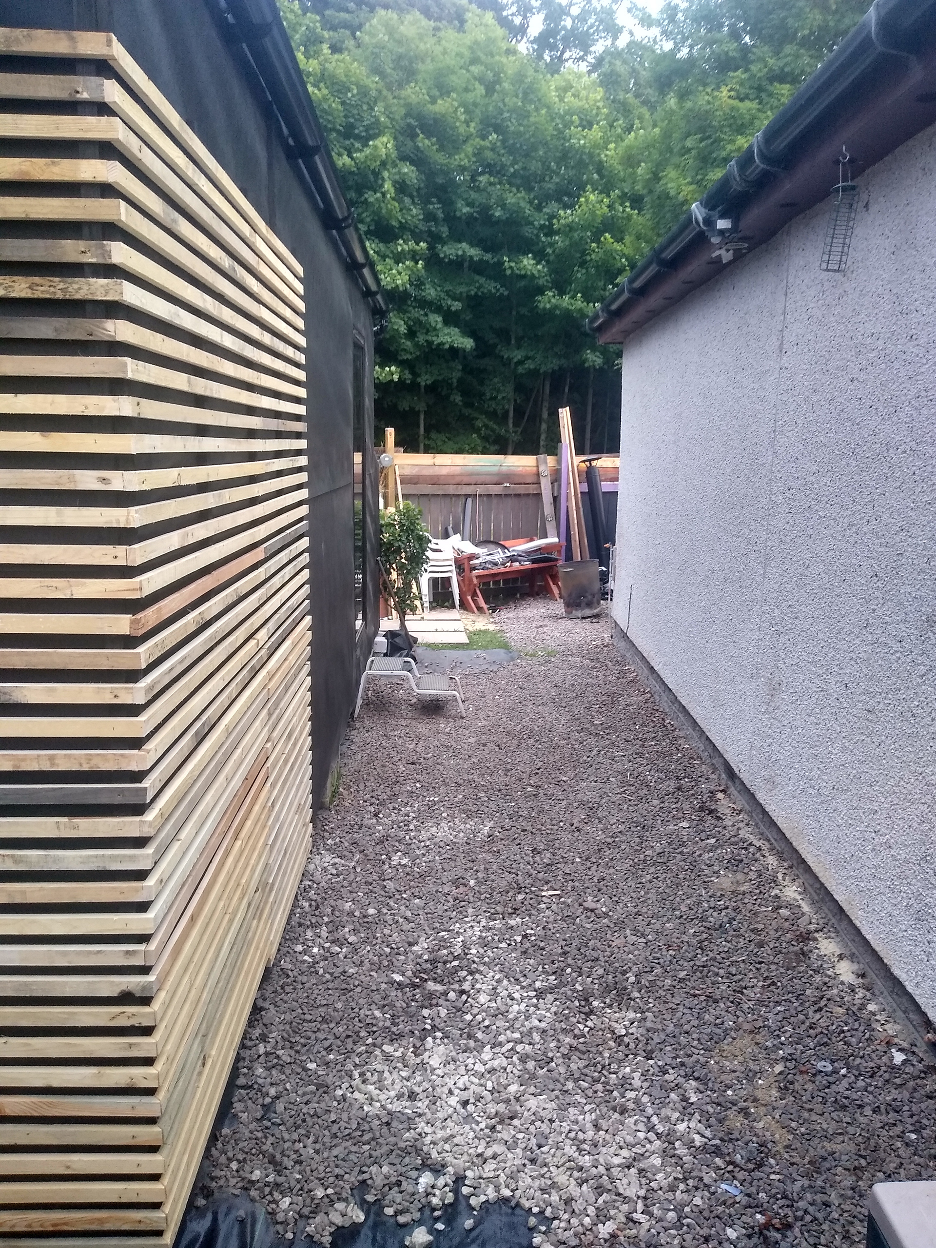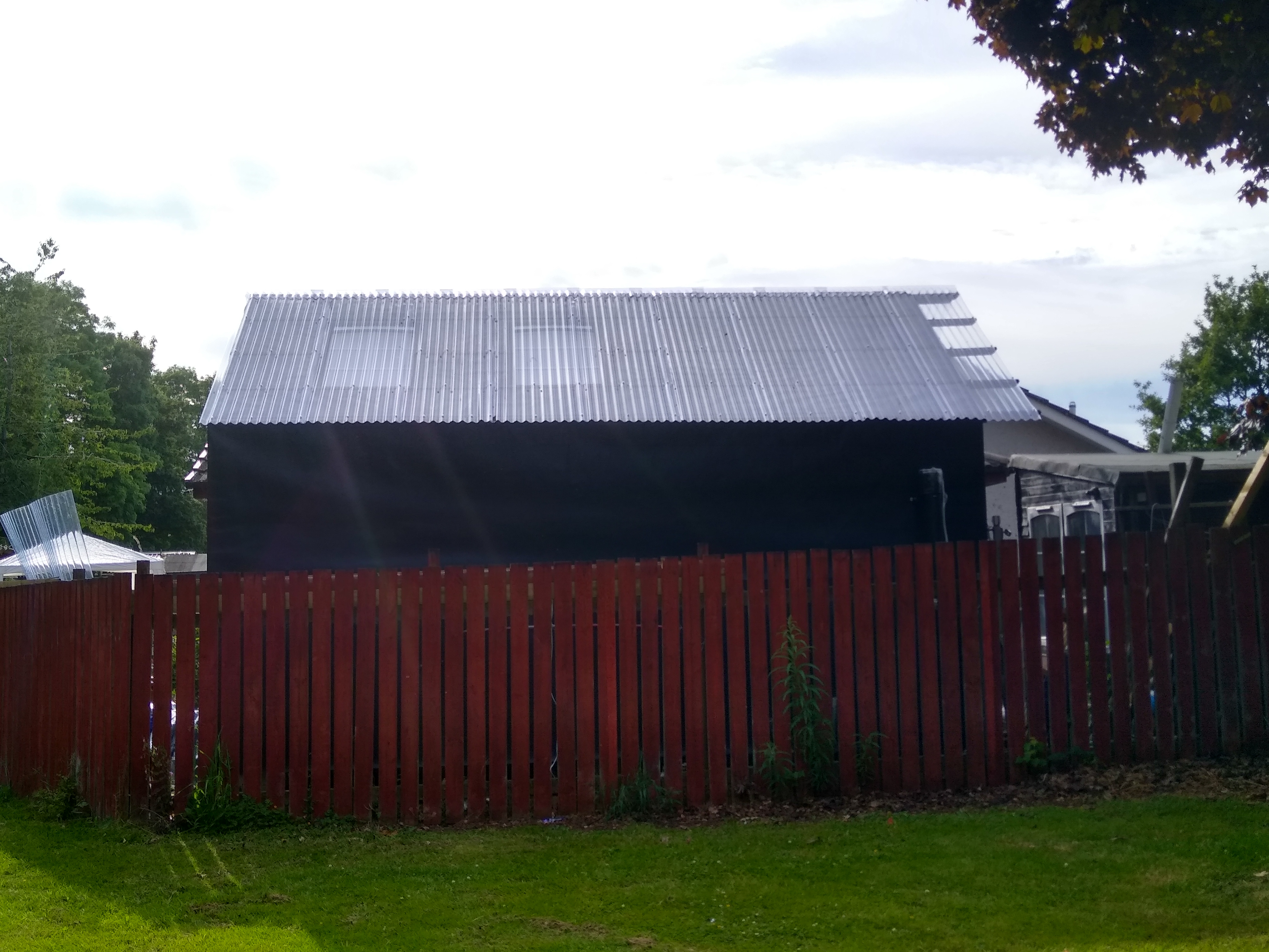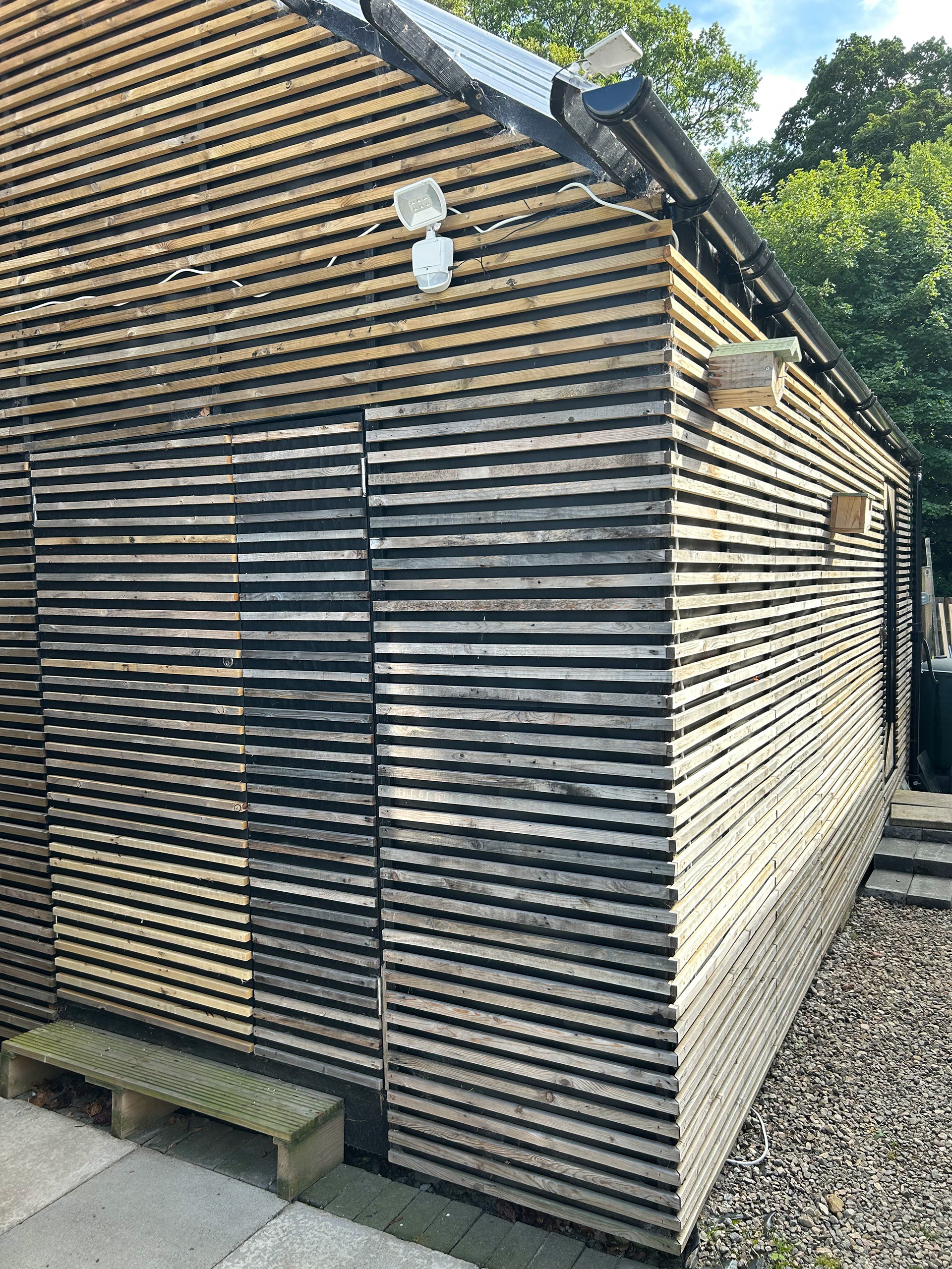 The 'shed' is 4x6m and utilises the cladding of the old shed as the cladding of the new, stripped and spaced so that it could cover the area of the new larger structure.